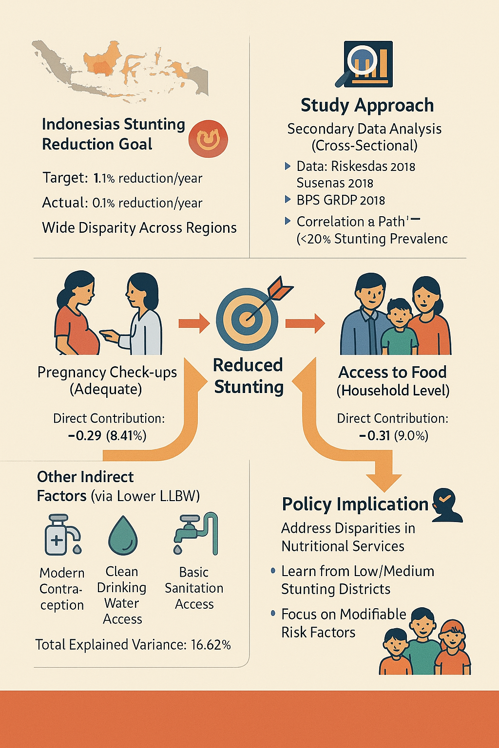 Results: There is a significant relationship between access to food and the prevalence of stunting at the district/city level (p-value <0.05; r-value = 0.19). Pregnancy check-ups (path coefficient = -0.29) and access to food (path coefficient = -0.31) have a significant direct contribution to the prevalence of stunting at the district/city level.